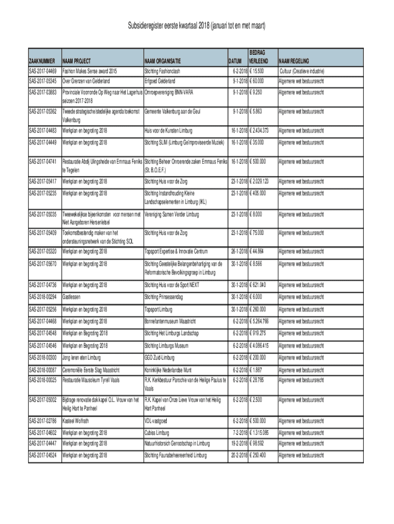 Subsidieregister verse quarter 2018 (January tot en met mart) BED RAG DATUM OVERSEEN 622018 15.500NAAM REELING Culture (Creative industries)912018 60.000Algemene wet bestuursrecht912018 9.250Algemene