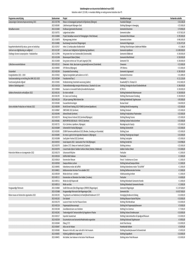 Subsidieregister van DE province Gelderland mart 2022