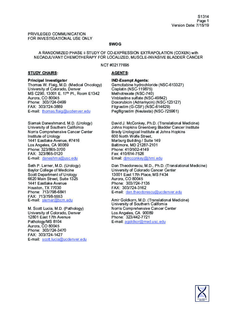 S1314 Page 1 Version Date: 7/15/19 PRIVILEGED COMMUNICATION FOR INVESTIGATIONAL USE ONLY SMOG TITLE PAGE A RANDOMIZED PHASE ii STUDY OF EXPRESSION EXTRAPOLATION (COHEN) with NEOADJUVANT CHEMOTHERAPY