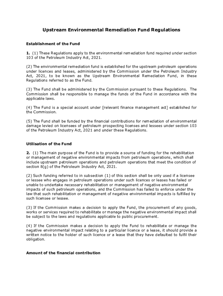 Upstream Environmental Remediation Fund Regulations Establishment of the Fund 1. (1) These Regulations apply to the environmental remediation fund required under section 103 of the Petroleum Industry
