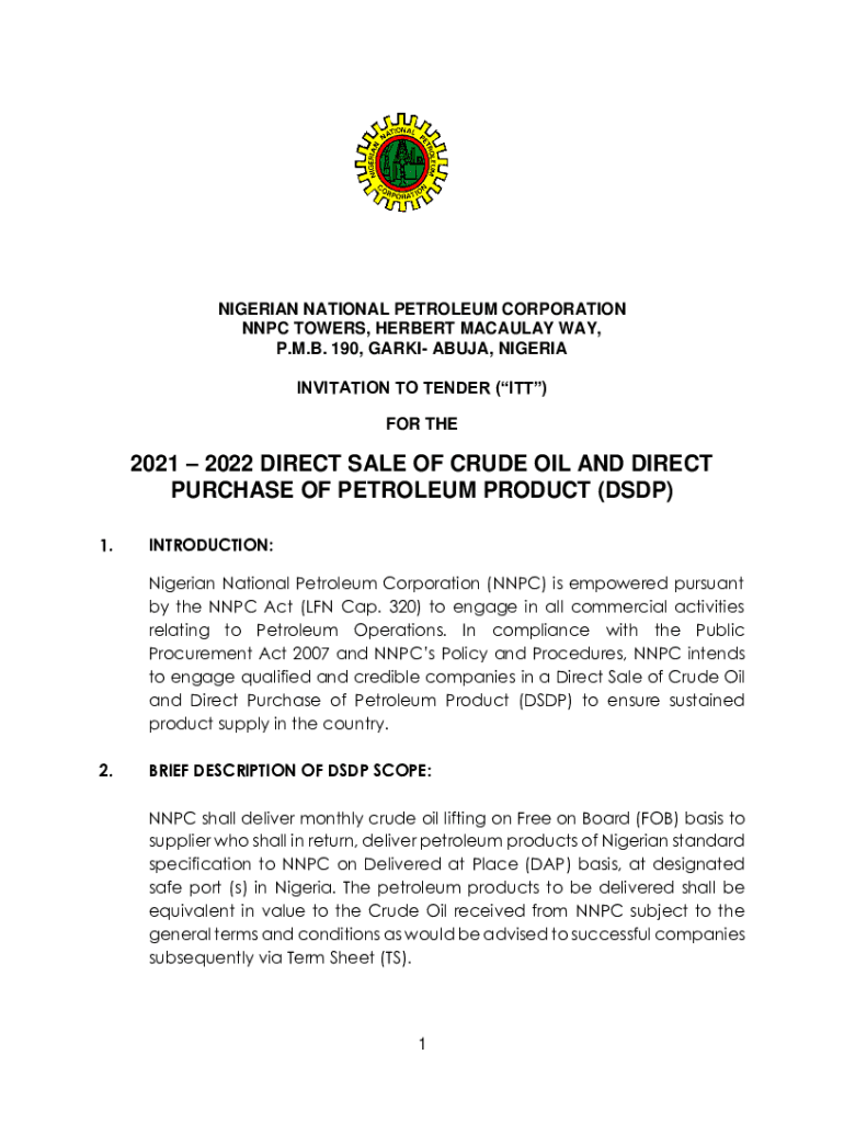 NIGERIAN NATIONAL PETROLEUM CORPORATION NPC TOWERS, HERBERT MACAULAY WAY, P.M.B. 190, PARK ABUJA, NIGERIA INVITATION TO TENDER (ITT) FOR THE2021 2022 DIRECT SALE OF CRUDE OIL AND DIRECT PURCHASE OF