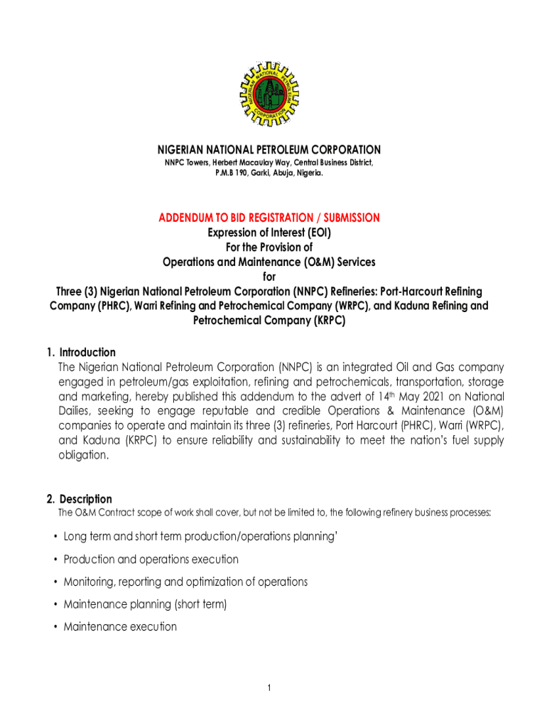 NIGERIAN NATIONAL PETROLEUM CORPORATION NPC Towers, Herbert Macaulay Way, Central Business District, P.M.B 190, Park, Abuja, Nigeria. ADDENDUM TO BID REGISTRATION / SUBMISSION Expression of Interest