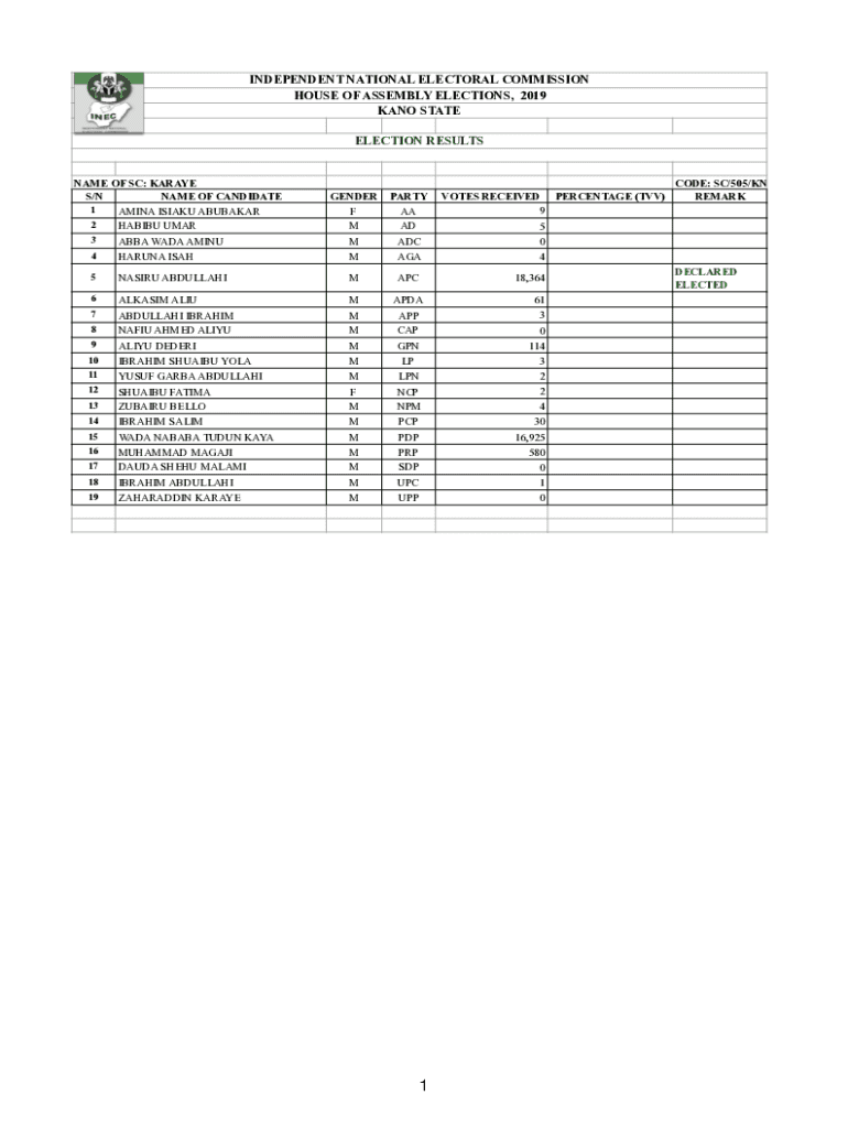 INDEPENDENT NATIONAL ELECTORAL COMMISSION HOUSE OF ASSEMBLY ELECTIONS, 2019 KANO STATE ELECTION RESULTS NAME OF SC: KARATE S/N NAME OF CANDIDATE 1 AMINA ISI AKU ABUBAKAR 2 HABIT UMAR 3GENDER FM PARTY