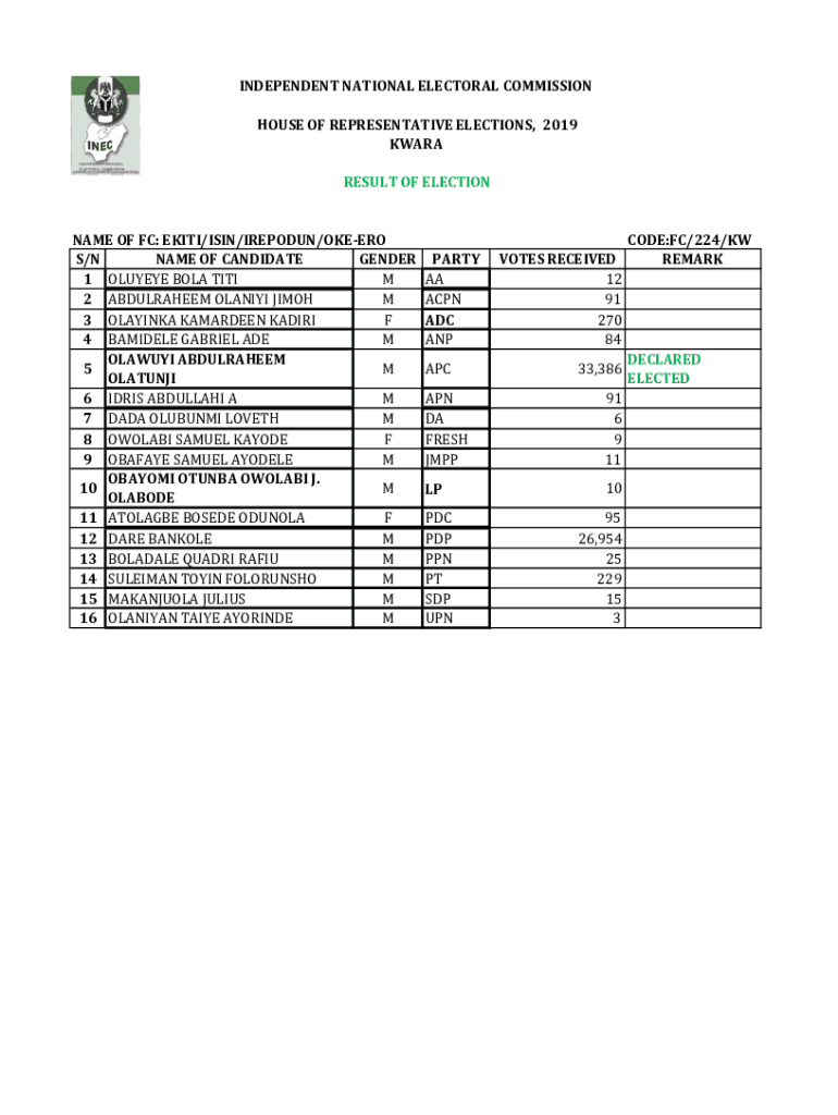 Political parties in Kwara State, Nigeria are required to file kwara fcxlsx - inec.