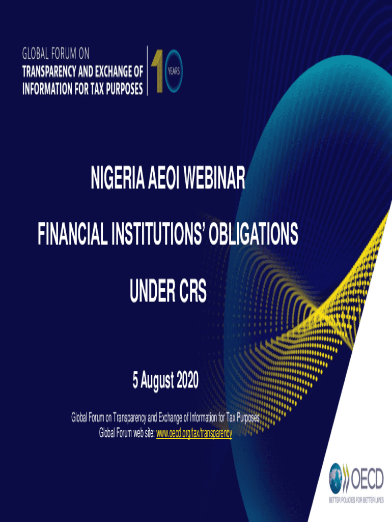 NIGERIA AEI WEBINAR FINANCIAL INSTITUTIONS OBLIGATIONS UNDER CRS 5 August 2020 Global Forum on Transparency and Exchange of Information for Tax Purposes Global Forum website: www.oecd.org/tax/transparencyCurrent