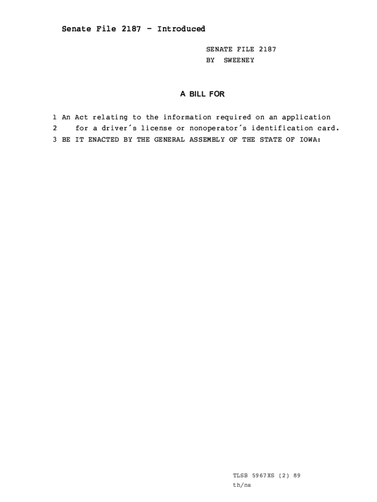 Senate File 2187 Introduced SENATE FILE 2187 BY SWEENEY BILL FOR1 An Act relating to the information required on an application 2 for a driver's license or nonoperators identification card. 3 BE IT