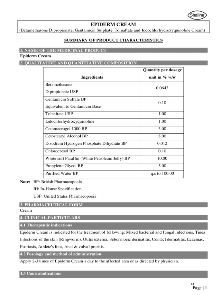 SPIDER CREAM (Propionate, Sulfate, Tolnaftate and Iodochlorhydroxyquinoline Cream) SUMMARY OF PRODUCT CHARACTERISTICS 1. NAME OF THE MEDICINAL PRODUCT Spider Cream 2. QUALITATIVE AND QUANTITATIVE