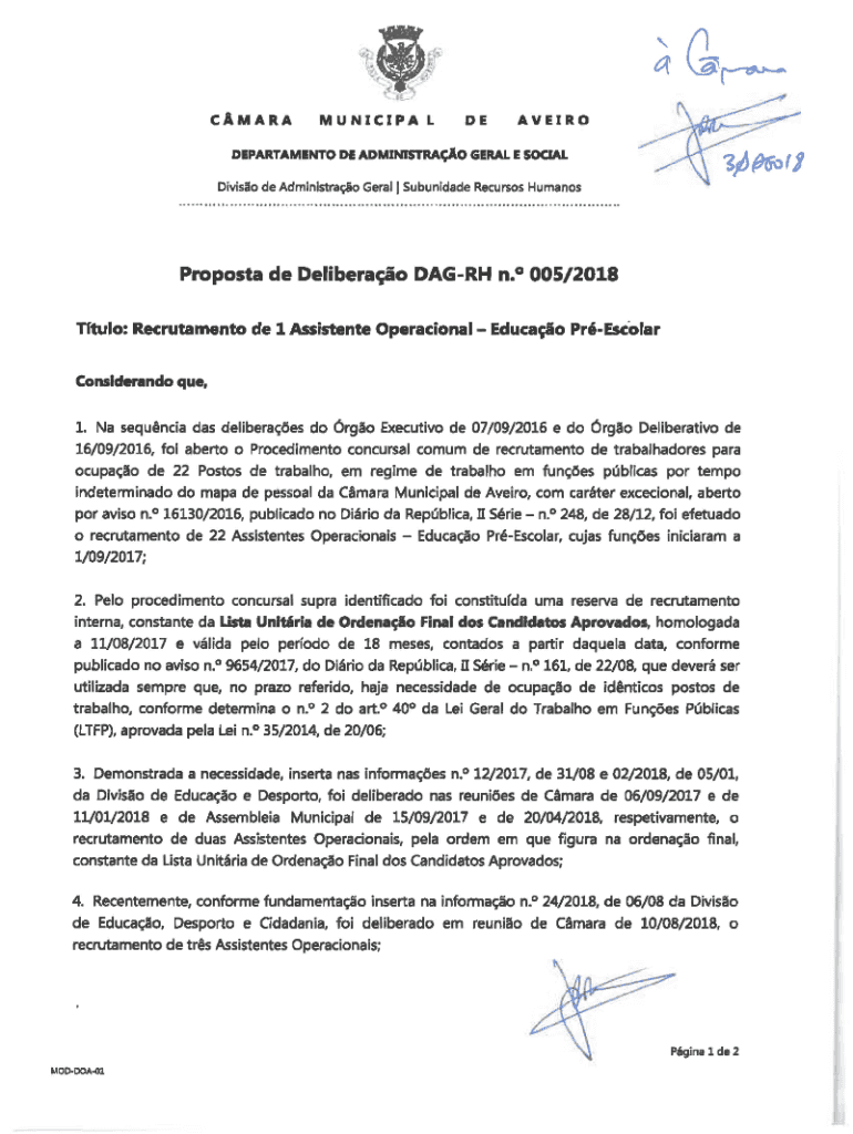 , i \”.,CAMARAf_MUNICIPA LDEAVEIRODEPARTAMENTO DE Administrator GERALD SOCIAL Divisor de Administrao Gerald I Subunidade Precursor HumanosProposta de Deliberao DGRH n.o 005/2018 Truly: Recruitment