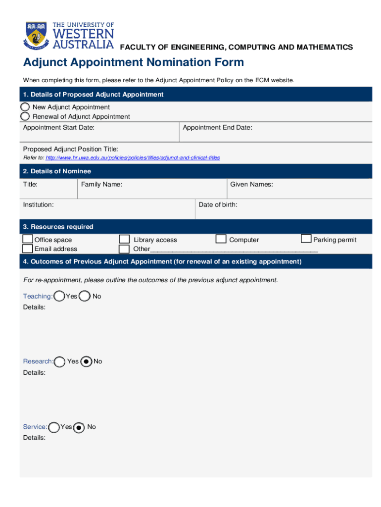 FACULTY OF ENGINEERING, COMPUTING AND MATHEMATICSAdjunct Appointment Nomination Form When completing this form, please refer to the Adjunct Appointment Policy on the ECM website.1. Details of Proposed