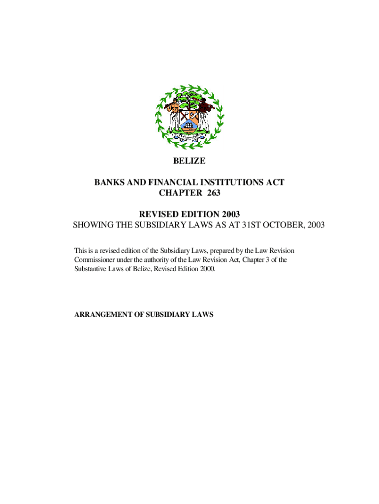 BELIZE BANKS AND FINANCIAL INSTITUTIONS ACT CHAPTER 263 REVISED EDITION 2003 SHOWING THE SUBSIDIARY LAWS AS AT 31ST OCTOBER 2003 This is a revised edition of the Subsidiary Laws, prepared by the Law