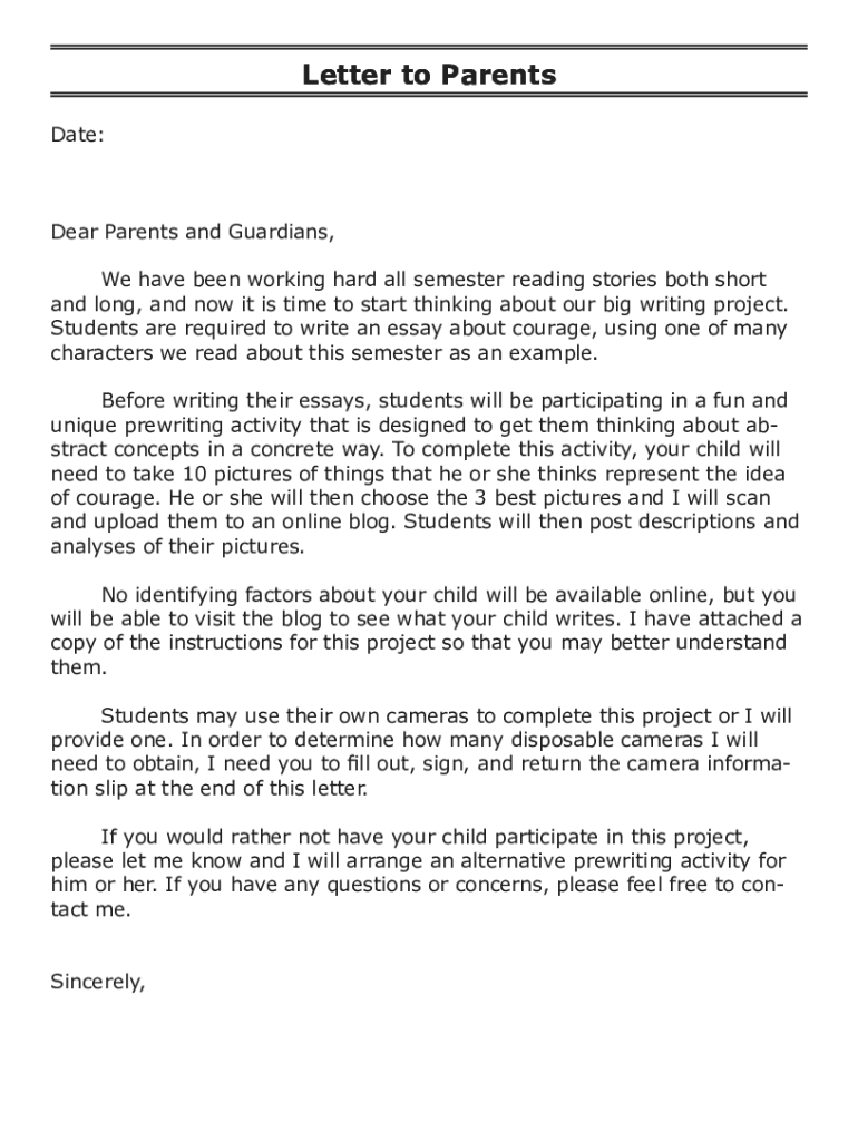 Letter to Parents Date:Dear Parents and Guardians, We have been working hard all semester reading stories both short and long, and now it is time to start thinking about our big writing project. Students