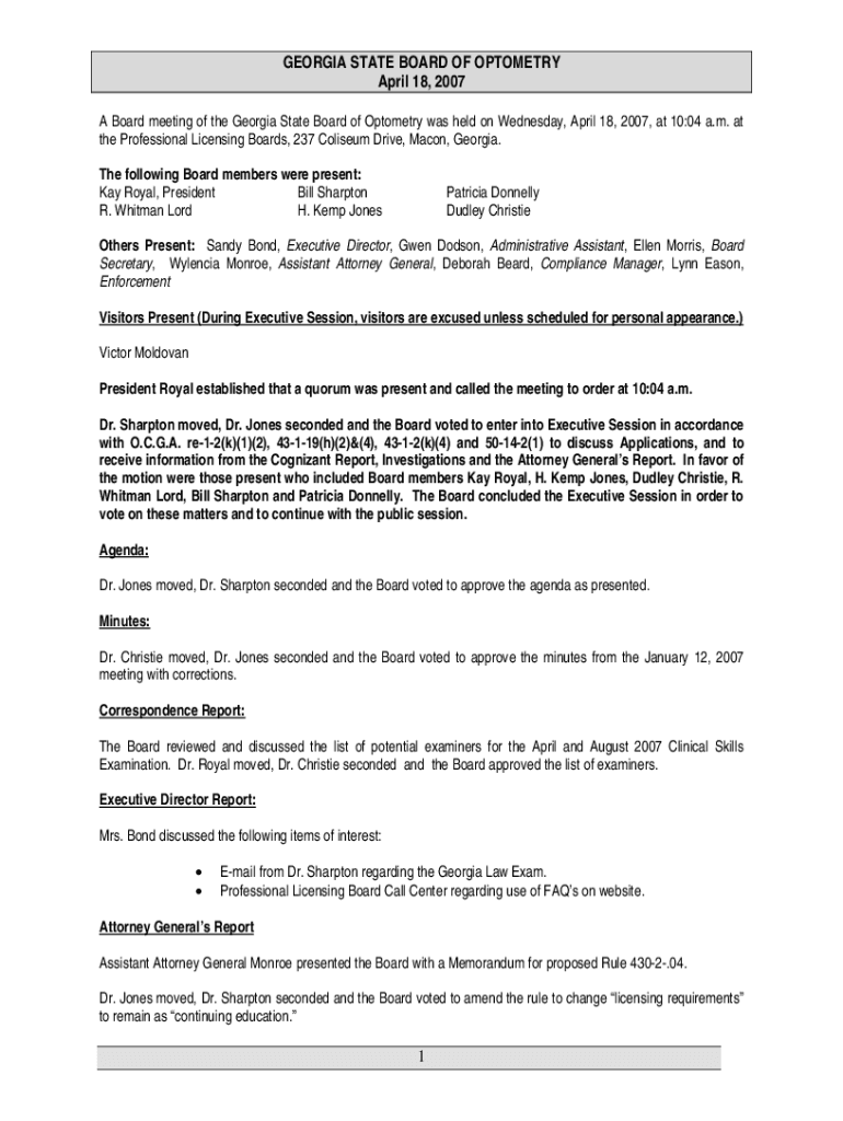 GEORGIA STATE BOARD OF OPTOMETRY April 18, 2007, A Board meeting of the Georgia State Board of Optometry was held on Wednesday, April 18, 2007, at 10:04 a.m. at the Professional Licensing Boards,
