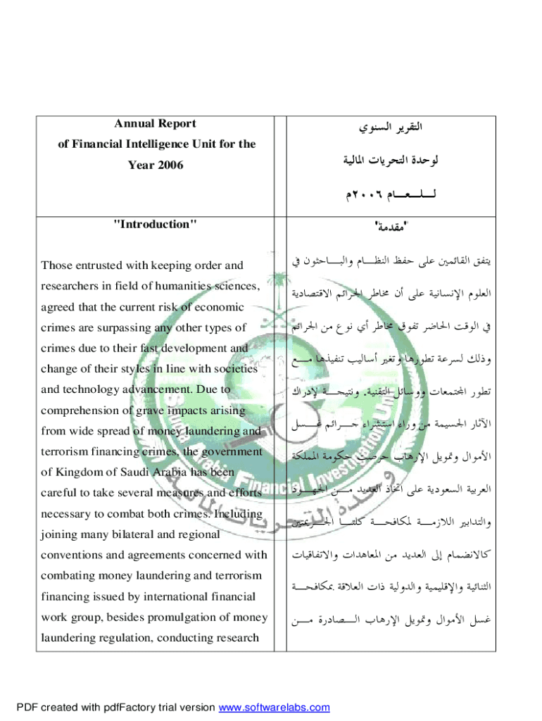 Annual Report of Financial Intelligence Unit for the Year 2006 \”\”\” Introduction\” Those entrusted with keeping order and researchers in field of humanities sciences, agreed that the current