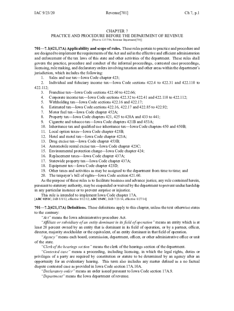 IAC 9/23/20Revenue[701]Ch 7, p.1CHAPTER 7 PRACTICE AND PROCEDURE BEFORE THE DEPARTMENT OF REVENUE [Prior to 12/17/86, Revenue Department[730]]7017.1(421,17A) Applicability and scope of rules. These