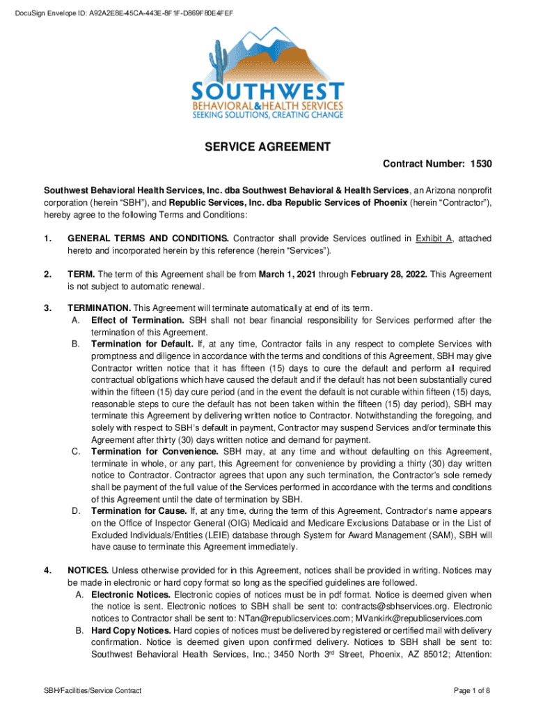 DocuSign Envelope ID: A92A2E8E45CA443E8F1FD869F80E4FEFSERVICE AGREEMENT Contract Number: 1530 Southwest Behavioral Health Services, Inc. DBA Southwest Behavioral & Health Services, an Arizona nonprofit