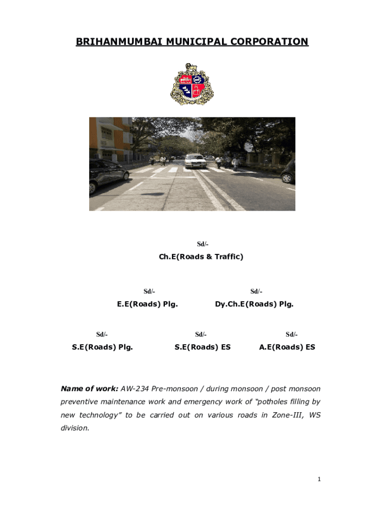 BRIHANMUMBAI MUNICIPAL Corporations/Ch. E(Roads & Traffic)SD/SD/E. E(Roads) PLG. Dy. Ch. E(Roads) PLG. SD/SD/S. E(Roads) PLG. S. E(Roads) ESSD/A. E(Roads) Name of work: AW234 Monsoon / during monsoon