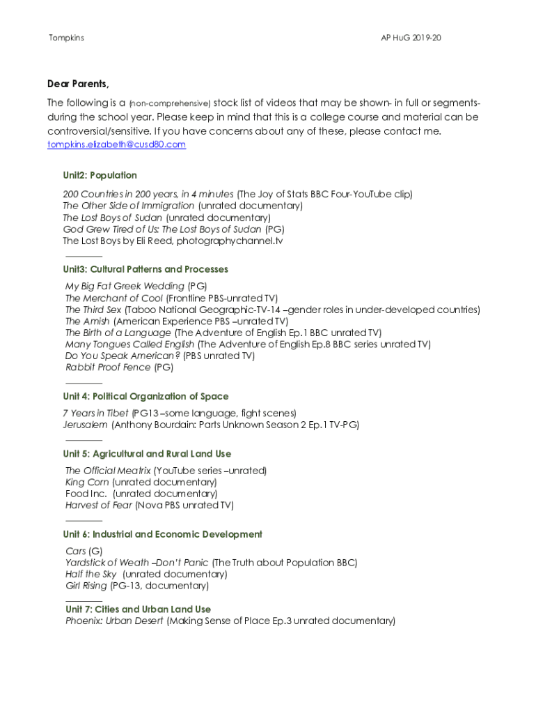 Tompkins AP Hug 201920Dear Parents, The following is a (noncomprehensive) stock list of videos that may be shown in full or segments during the school year. Please keep in mind that this is a college