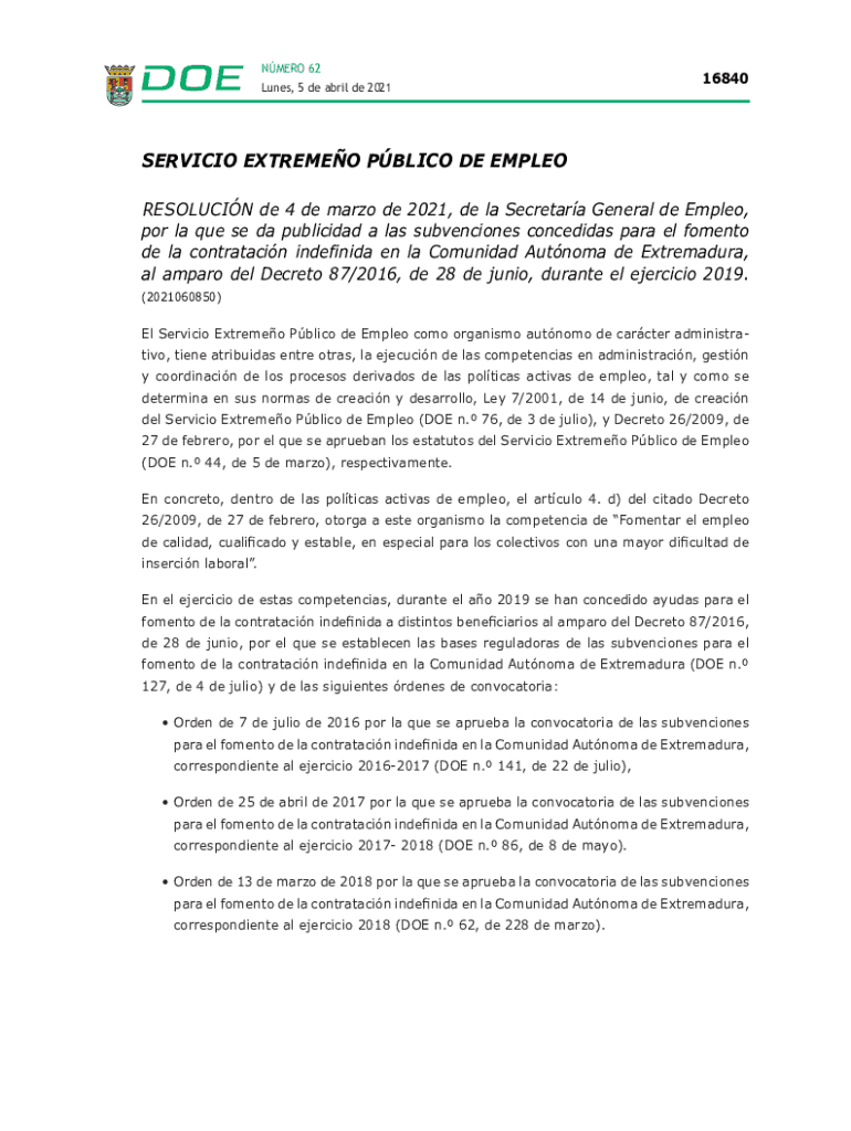 NERO 62 Lines, 5 de April de 202116840SERVICIO EXTREME PBL ICO DE TEMPLE RESOLUTION DE 4 de Mario de 2021, DE la Secretary General de Empleo, POR la Que SE the publicized a leis subventions conceded
