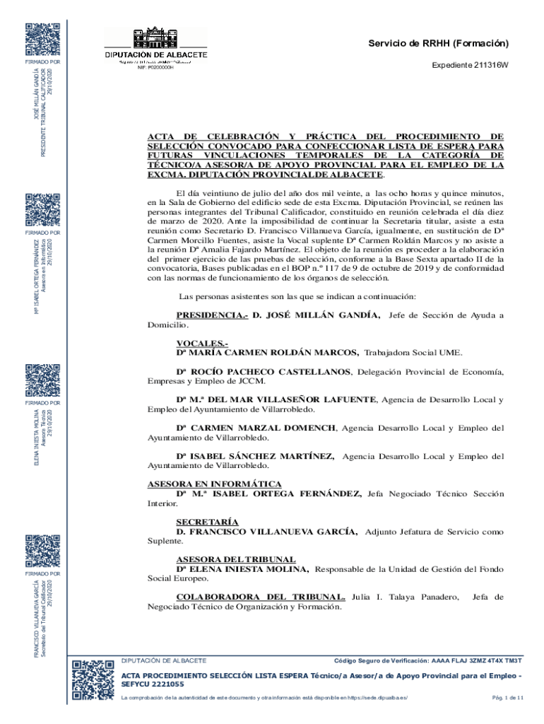 Get the free ACTA PROCEDIMIENTO SELECCIN LISTA ESPERA Tcnico/a Asesor/a de Apoyo Provincial para ...