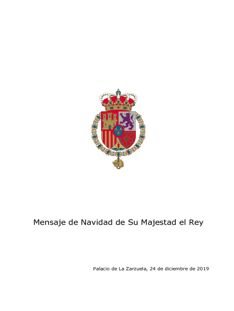 Mensaje de Navidad de Su Majestad el ReyPalacio de La Zarzuela, 24 de diciembre de 2019Buenas noches, Hace cinco aos tuve el honor, por primera vez como Rey, de felicitaros la Navidad y de transmitiros