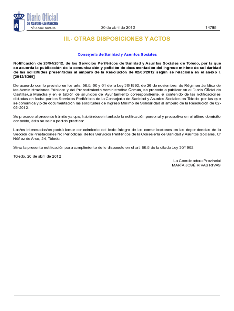 Notification DE 20/04/2012, de Los Services Peripheries de Sanidad y Santos Socials de Toledo,