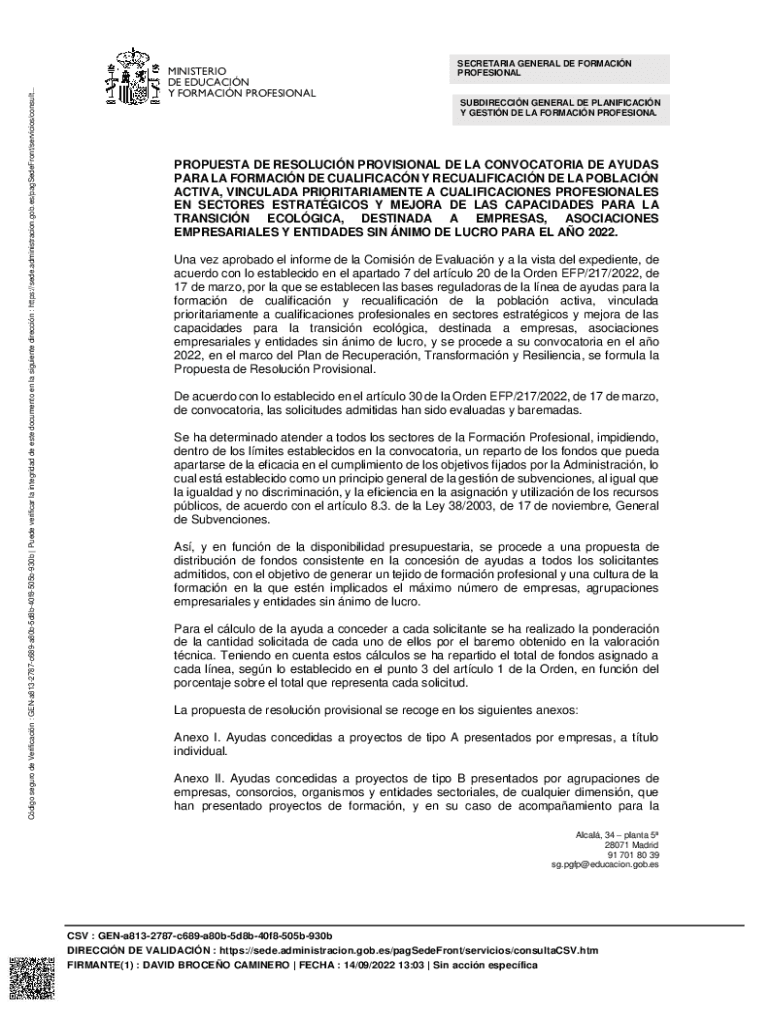 Cargo Segura de Verification : GENa8132787c689a80b5d8b40f8505b930b | Suede verifier la integral DE ester document en la migraine direction : https://sede.administracion.gob.es/pagSedeFront/servicios/consult...MINISTER
