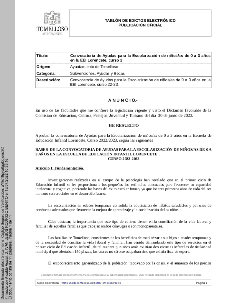 PUBLICATION OFICIALTtulo:Convocatoria de Ayudas para la Escolarizacin de BIOS/as DE 0 a 3 AOS