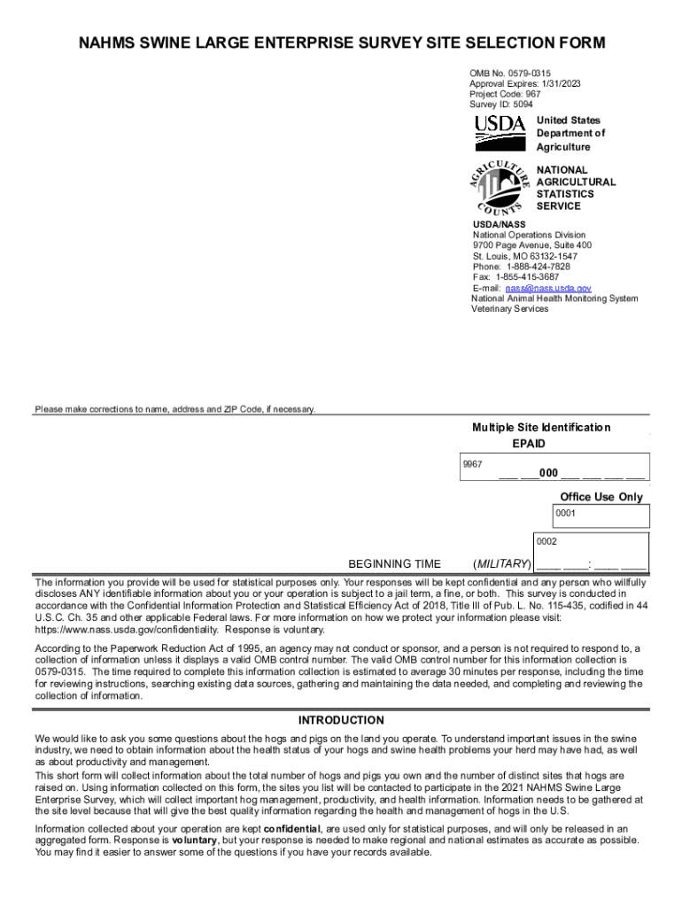 NAH, MS! SWINE LARGE ENTERPRISE SURVEY SITE SELECTION FORM OMB No. 05790315 Approval Expires: 1/31/2023 Project Code: 967 Survey ID: 5094United States Department of Agriculture NATIONAL AGRICULTURAL