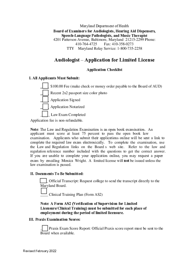 Get the free Audiologist Application for Limited License - Maryland.gov