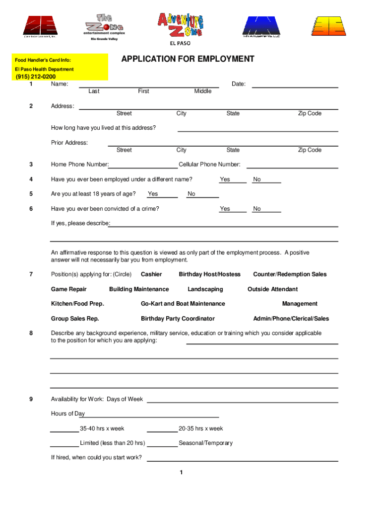 APPLICATION FOR EMPLOYMENTFood Handler\'s Card Info: El Paso Health Department(915) 2120200 1 Name:Date: Last2FirstMiddleAddress: StreetCityStateZip CodeCityStateZip Somehow long have you lived at