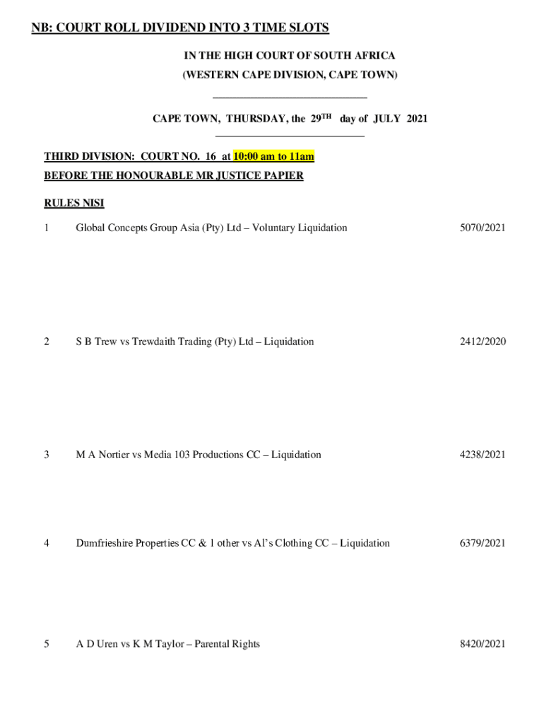 NB: COURT ROLL DIVIDEND INTO 3 TIME SLOTS IN THE HIGH COURT OF SOUTH AFRICA (WESTERN CAPE DIVISION, CAPE TOWN) ___ CAPE TOWN, THURSDAY, the 29TH day of JULY 2021 ___ THIRD DIVISION: COURT NO. 16 at