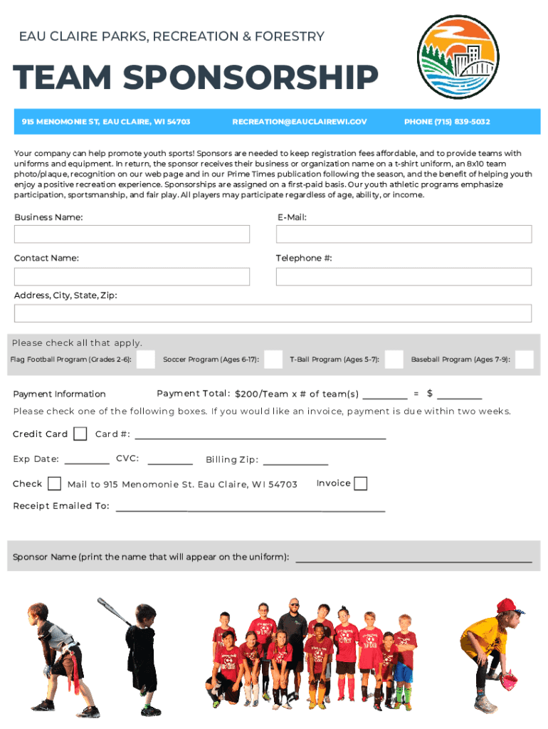 EAU CLAIRE PARKS, RECREATION & FORESTRYTEAM SPONSORSHIP 915 MENOMINEE ST, EAU CLAIRE, WI 54703RECREATION@EAUCLAIREWI.GOVPHONE (715) 8395032Your company can help promote youth sports! Sponsors are