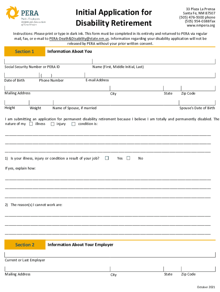 Initial Application for Disability Retirement33 Plaza La Prensa Santa Fe, NM 87507 (505) 4769300 phone (505) 9540388 fax www.nmpera.orgInstructions: Please print or type in dark ink. This form must