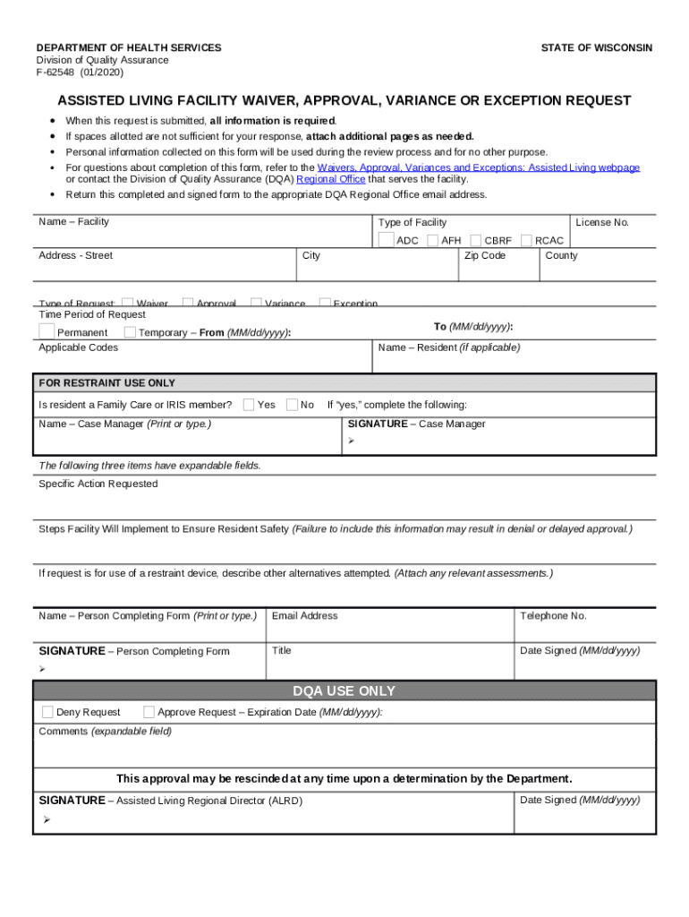Instructions for the Assisted Living Facility Request for Waiver, Approval, Variance or Exception, F-62548. 01100 form