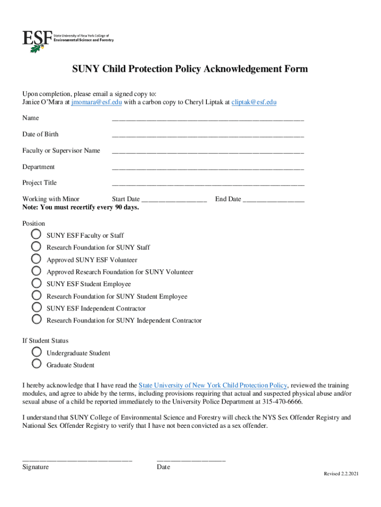 SUN Child Protection Policy Acknowledgement Form Upon completion, please email a signed copy to: Janice Omaha at jmomara@esf.edu with a carbon copy to Cheryl Lipton at cliptak@esf.edu Name___Date