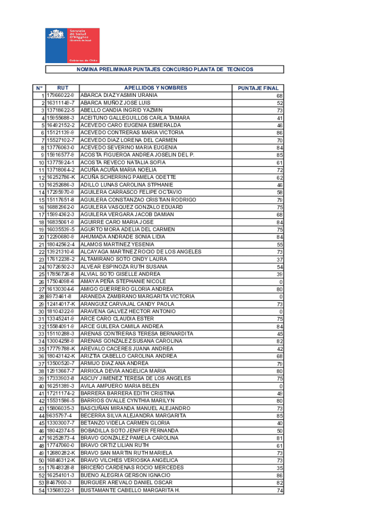 Get the free N RUT APELLIDOS Y NOMBRES PUNTAJE FINAL 1 ...