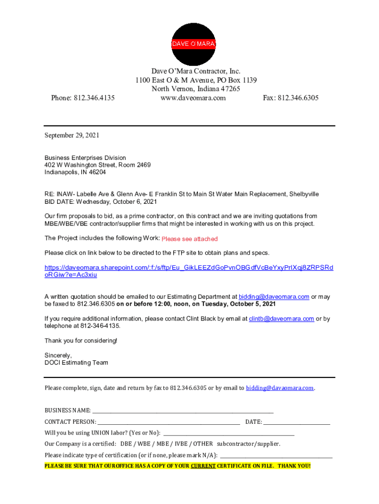 Phone: 812.346.4135Dave Omaha Contractor, Inc. 1100 East O & M Avenue, PO Box 1139 North Vernon, Indiana 47265 www.daveomara.com Fax: 812.346.6305September 29, 2021 Business Enterprises Division 402