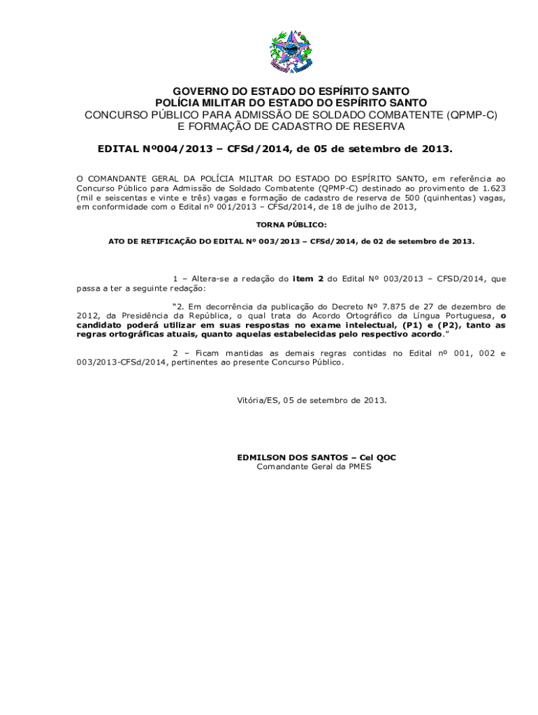 GOVERNOR DO ESTATE DO ESPRIT SANTA POL CIA MILITARY DO ESTATE DO ESPRIT SANTA CONCURS PBL ICO PARA ADMISSION DE SALADO COMBATANTS (QPM PC) E FORMAT DE CASTRO DE RESERVE EDIT AL N004/2013 CFS/2014,