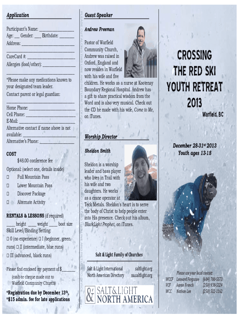 Participants Name: ___ Age: ___ Gender: ___ Birthdate: ___ Address: ___ ___ Harvard #: ___ Allergies (food/other): ___ ___ *Please make any medications known to your designated team leader. Contact