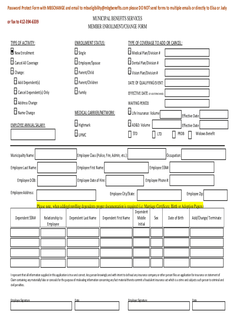 Password Protect Form with MISCHANCE and email to mbseligibility@mbgbenefits.com please DO NOT send forms to multiple emails or directly to Elisa or JudyMUNICIPAL BENEFITS SERVICES MEMBER ENROLLMENT/CHANGE
