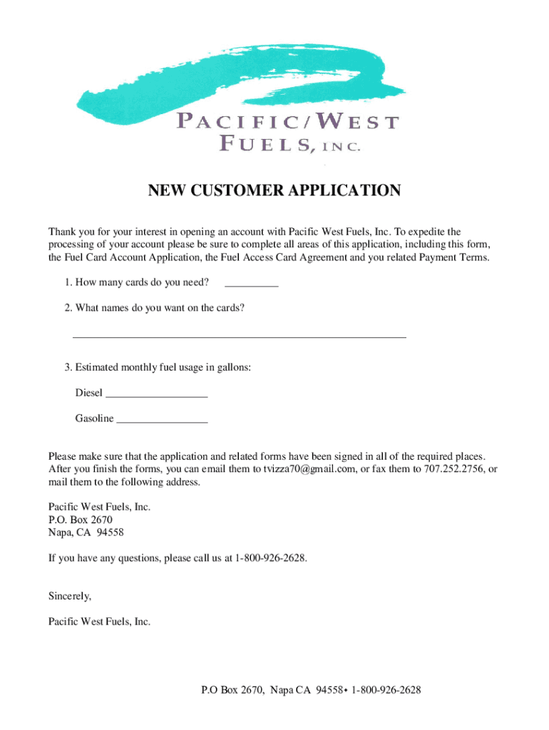 NEW CUSTOMER APPLICATION Thank you for your interest in opening an account with Pacific West Fuels, Inc. To expedite the processing of your account please be sure to complete all areas of this application,