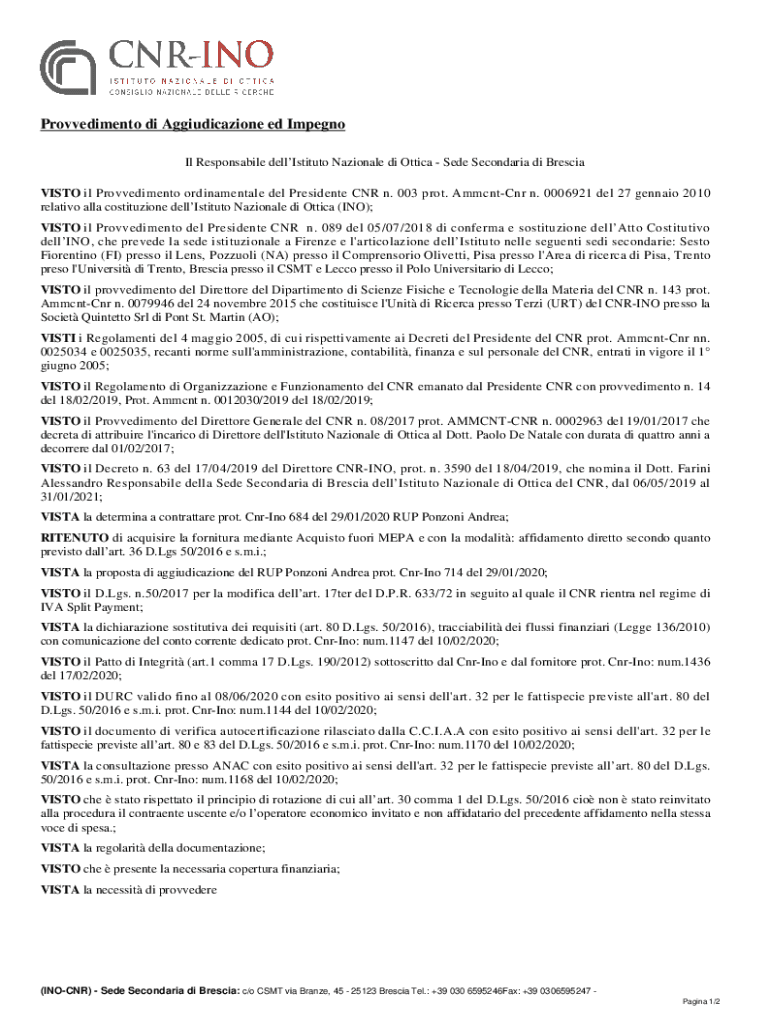 Provvedimento di Aggiudicazione ed Impugn IL Responsible dellIstituto National di Attica See Second aria DI Brescia VITO IL Provvedimento ornamental Del President CNR n. 003 plot. AmmcntCnr n. 0006921