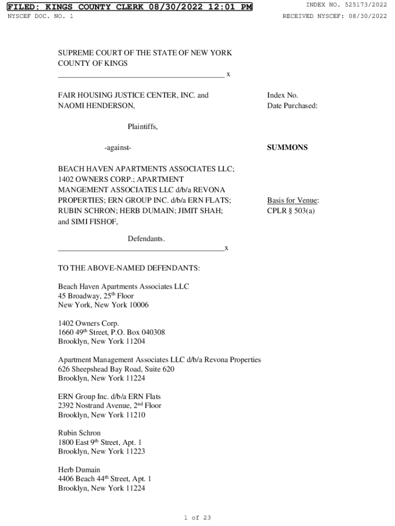 FILED: KINGS COUNTY CLERK 08/30/2022 12:01 PM NYSE DOC. NO. 1INDEX NO. 525173/2022 RECEIVED NYSE: 08/30/2022SUPREME COURT OF THE STATE OF NEW YORK COUNTY OF KINGS x FAIR HOUSING JUSTICE CENTER, INC.