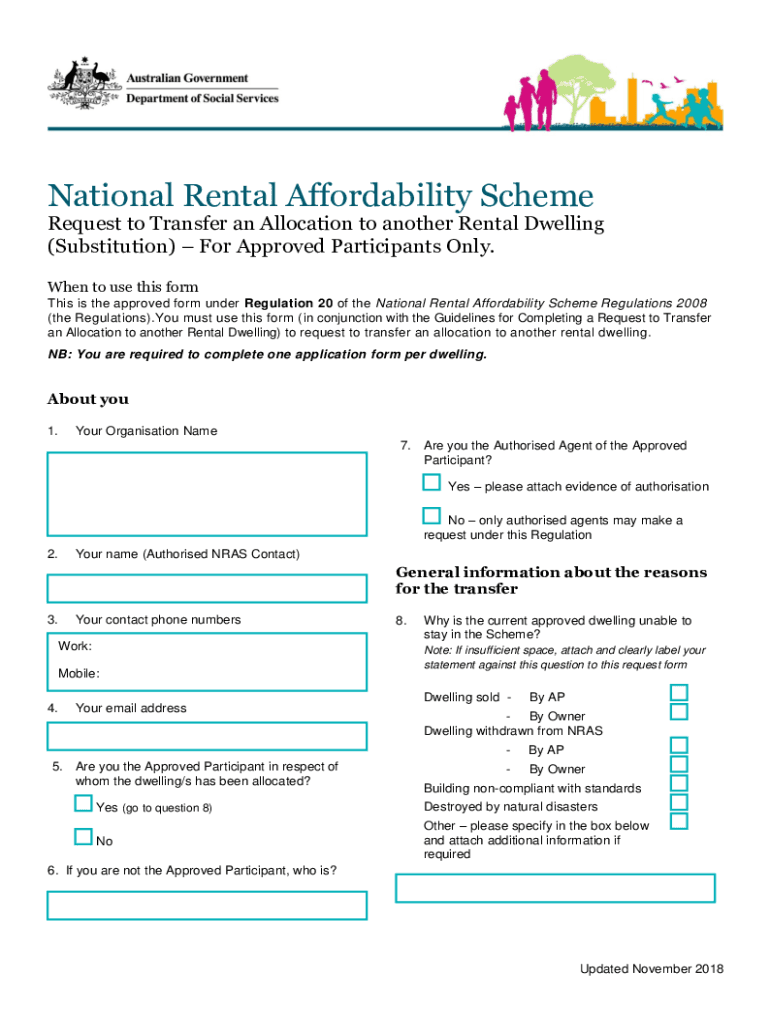 National Rental Affordability SchemeRequest to Transfer an Allocation to another Rental Dwelling (Substitution) For Approved Participants Only. When to use this form This is the approved form under