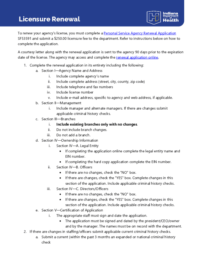 Licensure Renewal To renew your agencies license, you must complete a Personal Service Agency Renewal Application SF53591 and submit a $250.00 licensure fee to the department. Refer to instructions