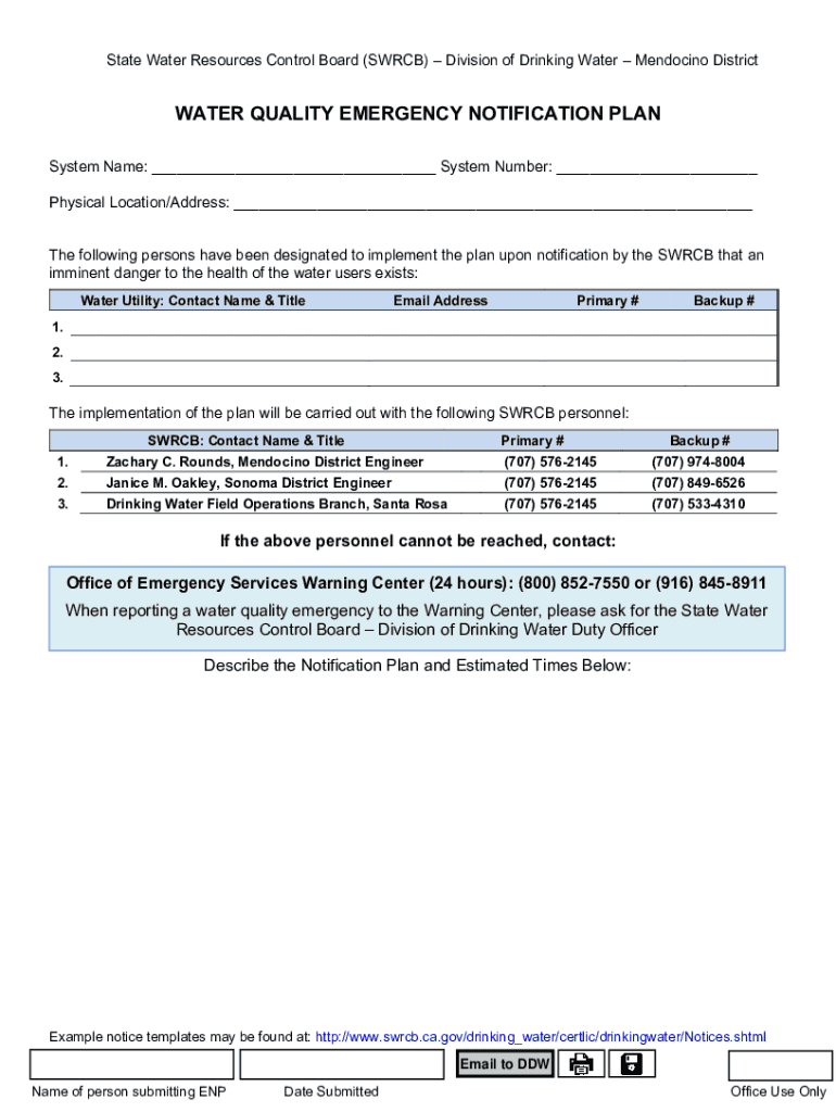 State Water Resources Control Board (SW RCB) Division of Drinking Water Mendocino DistrictWATER QUALITY EMERGENCY NOTIFICATION PLAN System Name: ___ System Number: ___ Physical Location/Address: ___