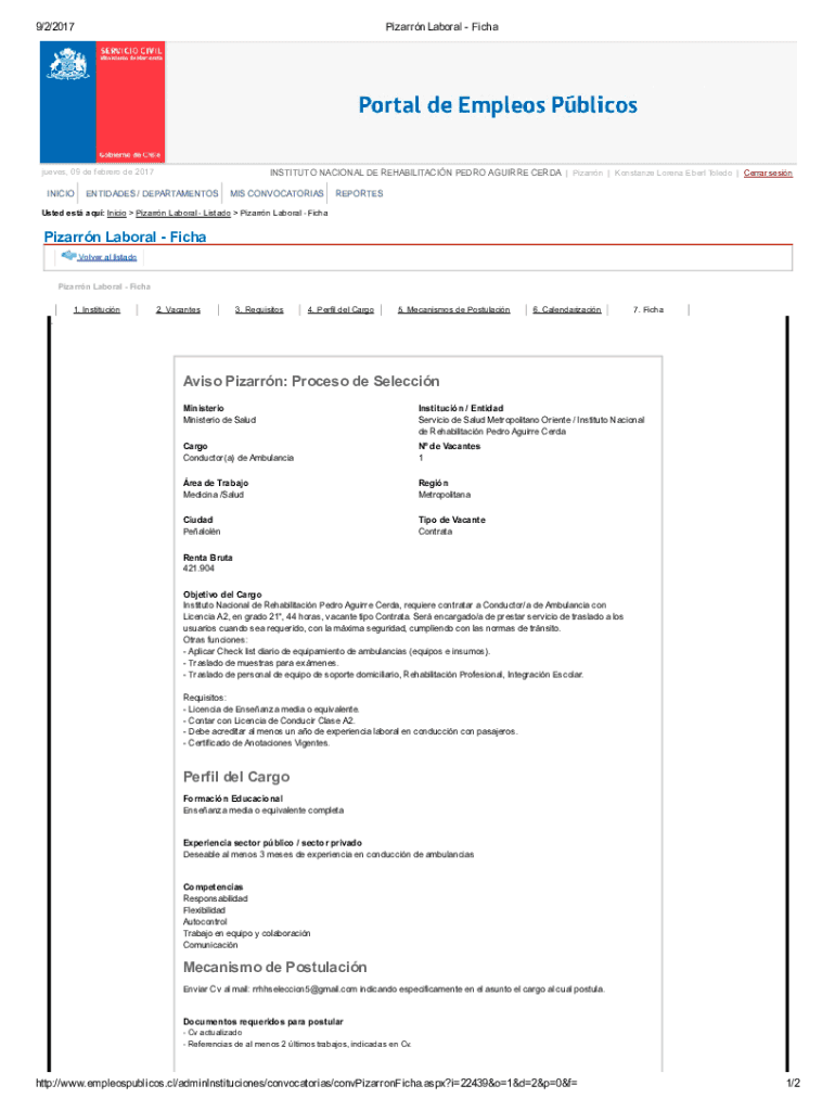 9/2/2017PizarrnLaboralFichajueves,09defebrerode2017INICIOINSTITUTONACIONALDEREHABILITACINPEDROAGUIRRECERDA|Pizarro|KonstanzeLorenaEberlToledo|CerrarsesinENTIDADES/DEPARTAMENTOSMISCONVOCATORIASREPORTESUstedestaqu:InicioPizarrnLaboralListadoPizarrnLaboralFichaPizarrnLaboralFicha