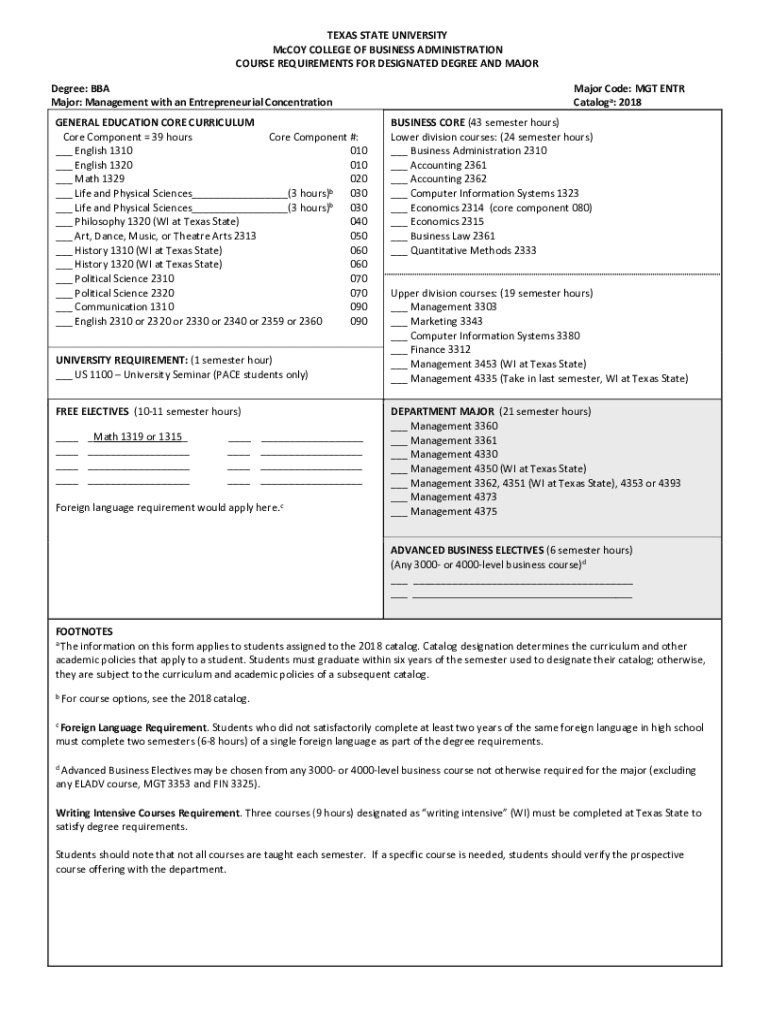 TEXAS STATE UNIVERSITY McCoy COLLEGE OF BUSINESS ADMINISTRATION COURSE REQUIREMENTS FOR DESIGNATED DEGREE AND MAJOR Degree: BBA Major: Management with an Entrepreneurial Concentration GENERAL EDUCATION