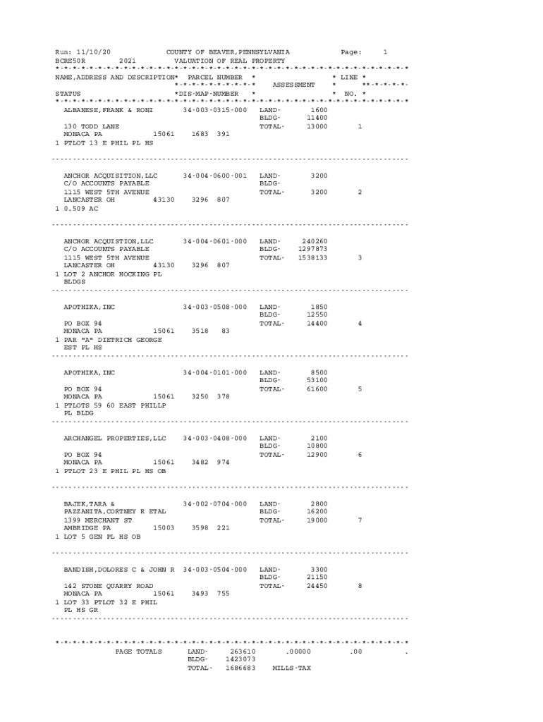 Run: 11/10/20 COUNTY OF BEAVER, PENNSYLVANIA Page: 1 BCRE50R 2021 VALUATION OF REAL PROPERTY ****************************************** NAME, ADDRESS AND DESCRIPTION* PARCEL NUMBER * * LINE * **********