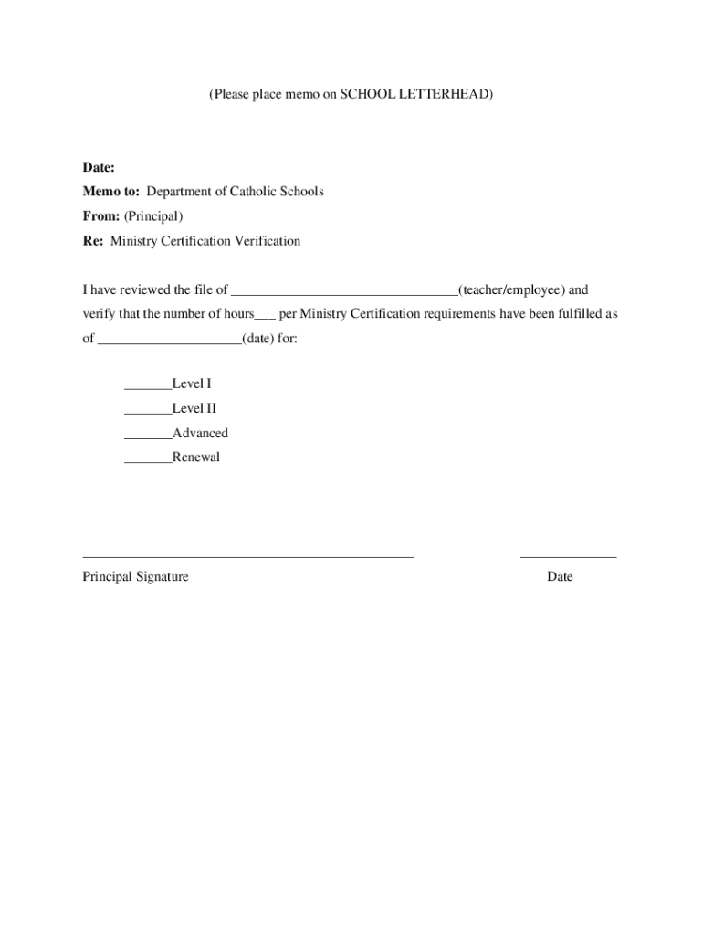 (Please place memo on SCHOOL LETTERHEAD)Date: Memo to: Department of Catholic Schools From: (Principal) Re: Ministry Certification Verification have reviewed the file of ___(teacher/employee) and
